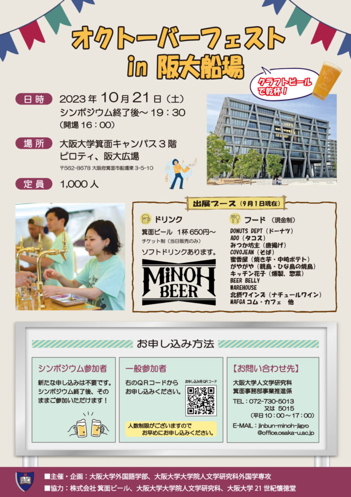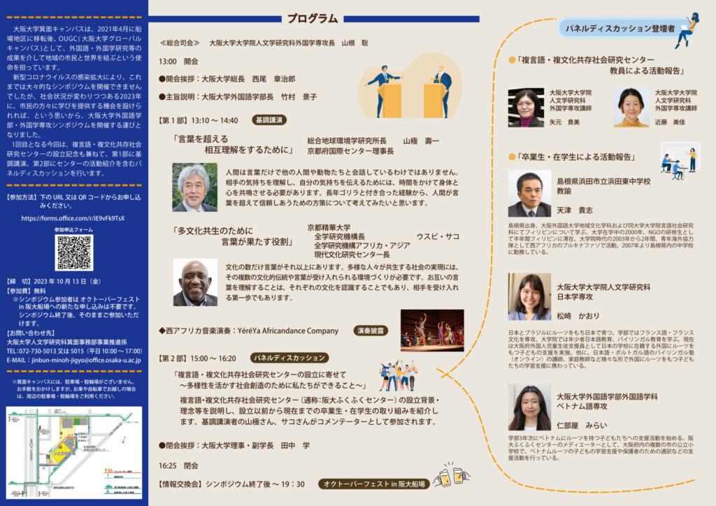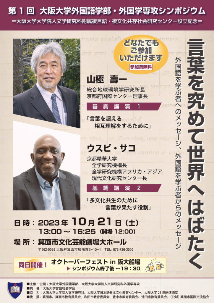 2023年10月21日、「大阪大学外国語学部・外国学専攻シンポジウム」の記念すべき第1回「言葉を究めて世界へはばたく」が箕面市立文化芸能劇場大ホールで開催されました。言語社会学会も共催として名を連ねました。
