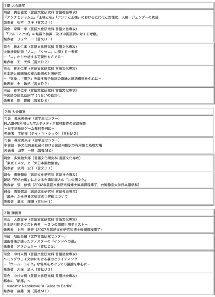 2008年 10月30日、初めての大阪大学言語文化学会と言語社会学会の合同研究会が、大阪大学豊中キャンパスの言語文化研究科棟で開催されました。冒頭、大阪大学言語文化学会の金崎研究科長(言語文化研究科長)が挨拶、その後3つの会場に分かれて、研究報告と討論が行われました。研究会の終了後、言語社会学会の三原代表理事(言語社会専攻長)が閉会の挨拶を行った後、会場をレストラン宙にうつして、和やかな懇親会が開かれました。