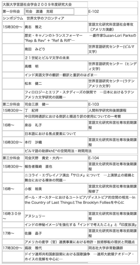15時30分からは、E棟に会場を移して、学会員の研究発表が行われました。今年度は、特に第一分科会で、世界文学のフロンテイアと題するシンポジウムが開催され、参加者の強い関心を引きました。